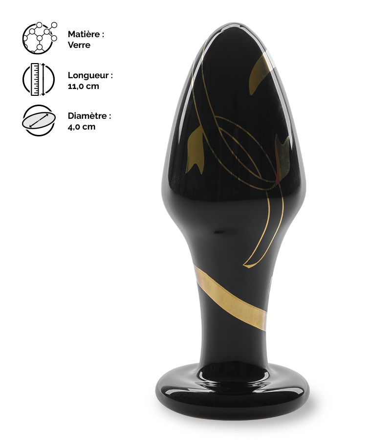Ce sextoy anal noir est joliment décoré de motifs dorés élégants qui font de lui un objet érotique et très esthétique. Conçu en verre, il possède une surface très lisse et un diamètre progressif. En ajoutant un peu de lubrifiant, son insertion sera très agréable tout en vous assurant une sécurité optimale grâce à sa base large. Son entretien sera également des plus pratiques puisque ce type de sextoys ne nécessite pas de précautions particulières. De plus, vous pourrez varier les sensations en plongeant votre plug dans une eau tiède ou froide pour changer sa température et vous surprendre.